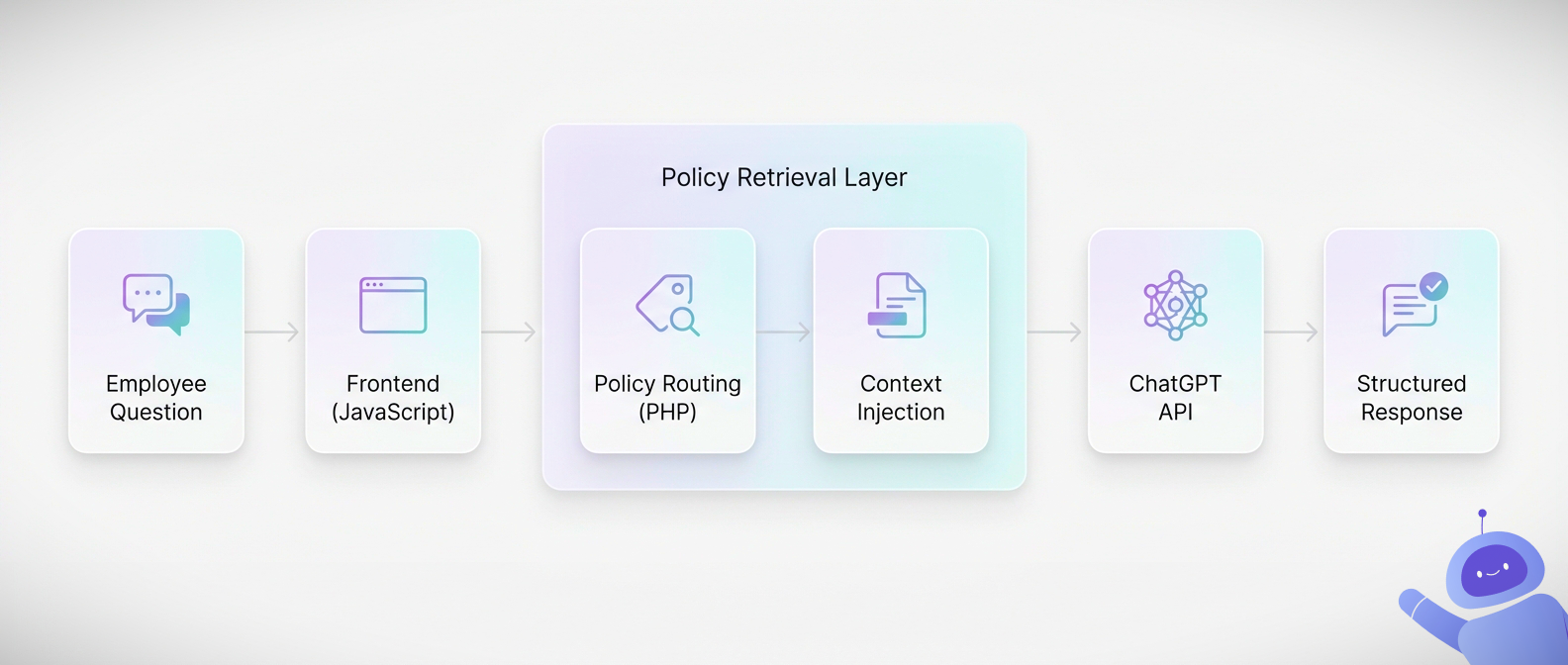 From there, I built the “safe answer” flow. The frontend collects the user’s question and sends it via AJAX to a PHP backend. The backend selects the best-matching policy file and passes only that excerpt into a fixed ChatGPT API prompt. The prompt forces a consistent response structure (acknowledge, clarify the ethical principle, suggest an aligned action, and redirect to HR or Legal when needed). If the question is outside scope (legal advice, personal decisions, judgment of intent, therapy-style support), the backend intercepts it before the API call and returns a controlled fallback.
