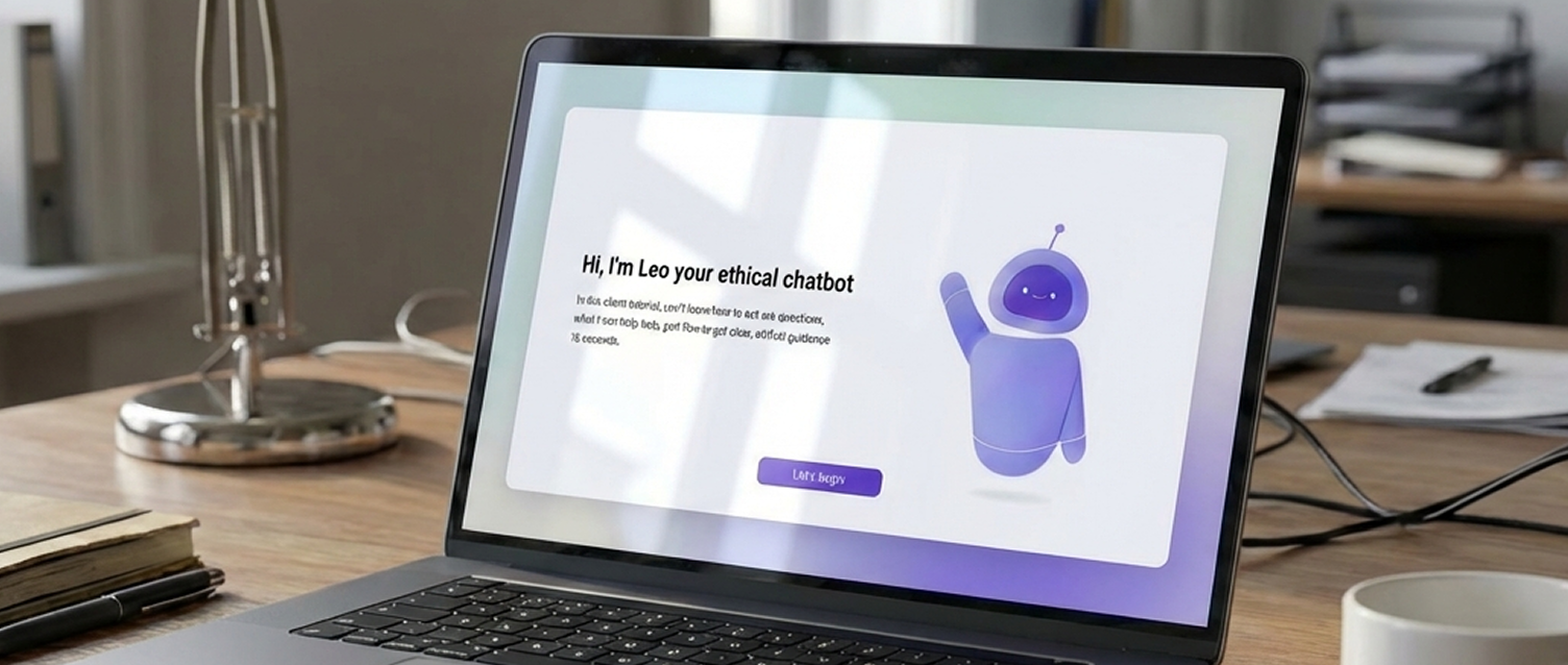 I approached this as a product design problem first: how do you make ethics guidance feel immediate, calm, and usable, without turning it into a risky “open AI” chatbot. I took inspiration from Microsoft’s onboarding experience (clean layouts, soft gradients, glass-like transparency) to create a neutral but friendly interface. Leo’s minimal 3D robot avatar sets the tone: approachable, not playful, and serious enough for compliance.
